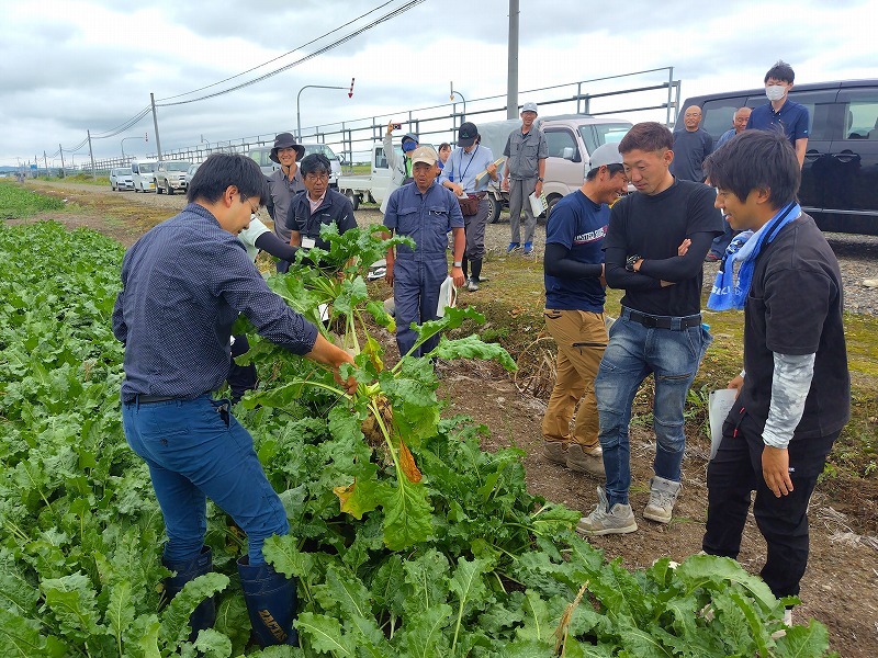 参加者にはてん菜作付経験のない若手農業者も多く、「残さの緑肥としての効果は魅力的」「他の作物との作業競合は?」などの声が聞かれていました。